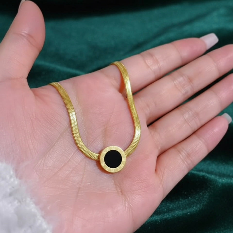 ⚫ Black Enamel Pendant with Roman Detailing: Elegant round design adds a modern and classy touch.
