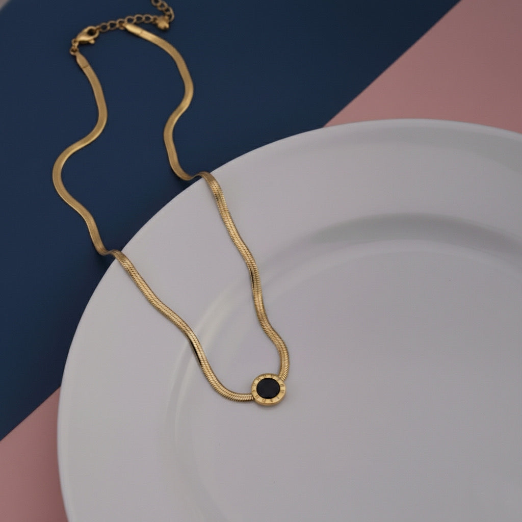 Add a touch of sophistication and modern charm to your look with this 18K gold plated black enamel pendant necklace. Designed with a flat snake chain and a Roman numeral engraved circular pendant, this piece radiates luxury and timeless elegance. The bold black enamel center creates a stunning contrast against the shiny gold plating, making it perfect for both daily wear and special occasions.