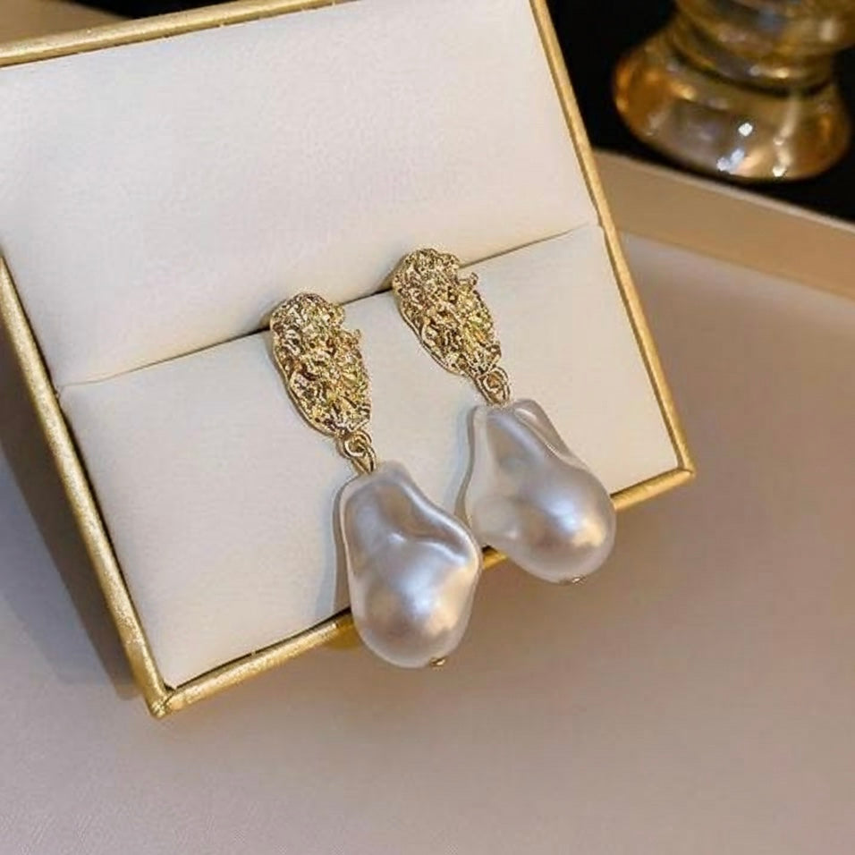Make a bold yet elegant statement with these baroque pearl drop earrings. Designed with a gold-plated textured top and a unique irregular pearl-like drop, these earrings exude luxury and sophistication. Perfect for women who love vintage-inspired jewelry, they can be styled with both ethnic and western outfits. Lightweight yet eye-catching, they are ideal for weddings, cocktail parties, festive wear, or romantic dinners, and also make a memorable gift for someone special.